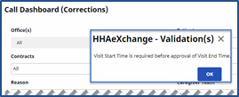 To track Caregiver Time Edit Requests go to the Corrections page on the Call Dashboard under Visit > Call Dashboard. Once a Caregiver submits a Correction, these requests are routed to the Call Dashboard Corrections page, comprised of two sections: Search and Results.