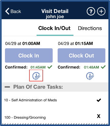 this Caregiver is presented with an edit icon next to the blank confirmed time (--:--).This option would be selected when the Caregiver forgot to Clock-In and/or Clock-Out. |