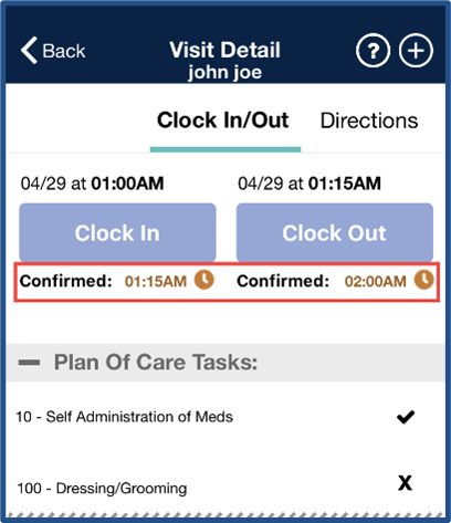 To Clock OUT, tap Clock Out, select the EVV method, and select the POC tasks performed. Tap Save to complete.