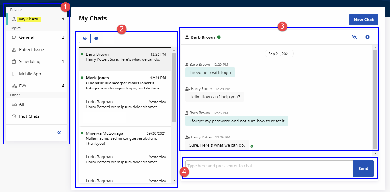 MyChats and Topics (if created for the Agency) appear on the left navigation panel. The number to the right of each label indicates the number of unread chat sessions within a Topic or MyChats.