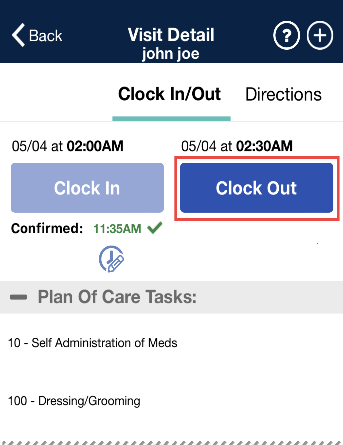 Once complete, the app alerts the Caregiver of a successful Clock Out for Visit 1.