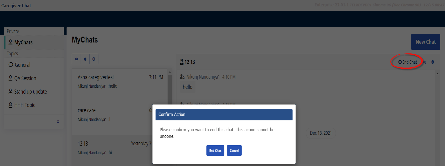 The End Chat feature allows Agency users to terminate chats with Caregivers. To terminate a Chat, Click the End Chat link at the top of the conversation pane, as seen in the image below. A Confirm Action pop-up window appears to confirm the termination. Click the End Chat button to close the chat.
