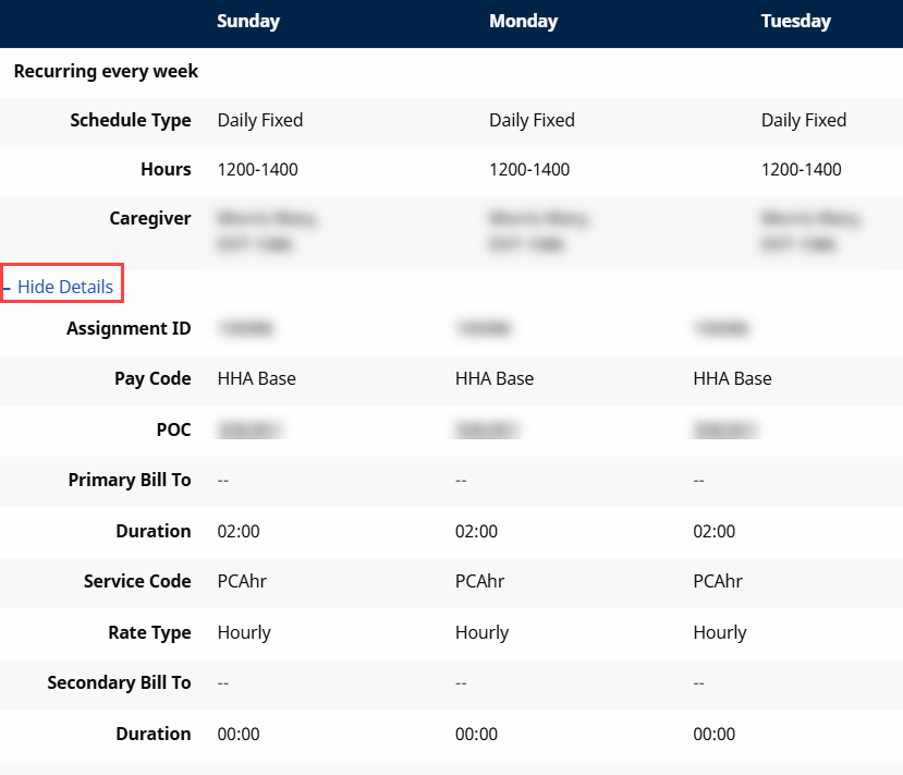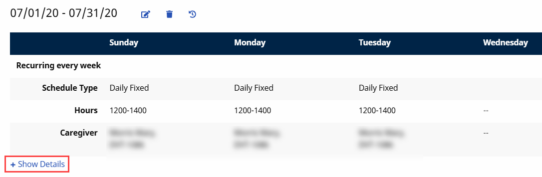 On a search result, various icons are displayed indicating available options. In the classic system, a banner would pop up showing the schedule. In the new UI, Click the schedule icon to open the Caregiver Schedule window to view details.