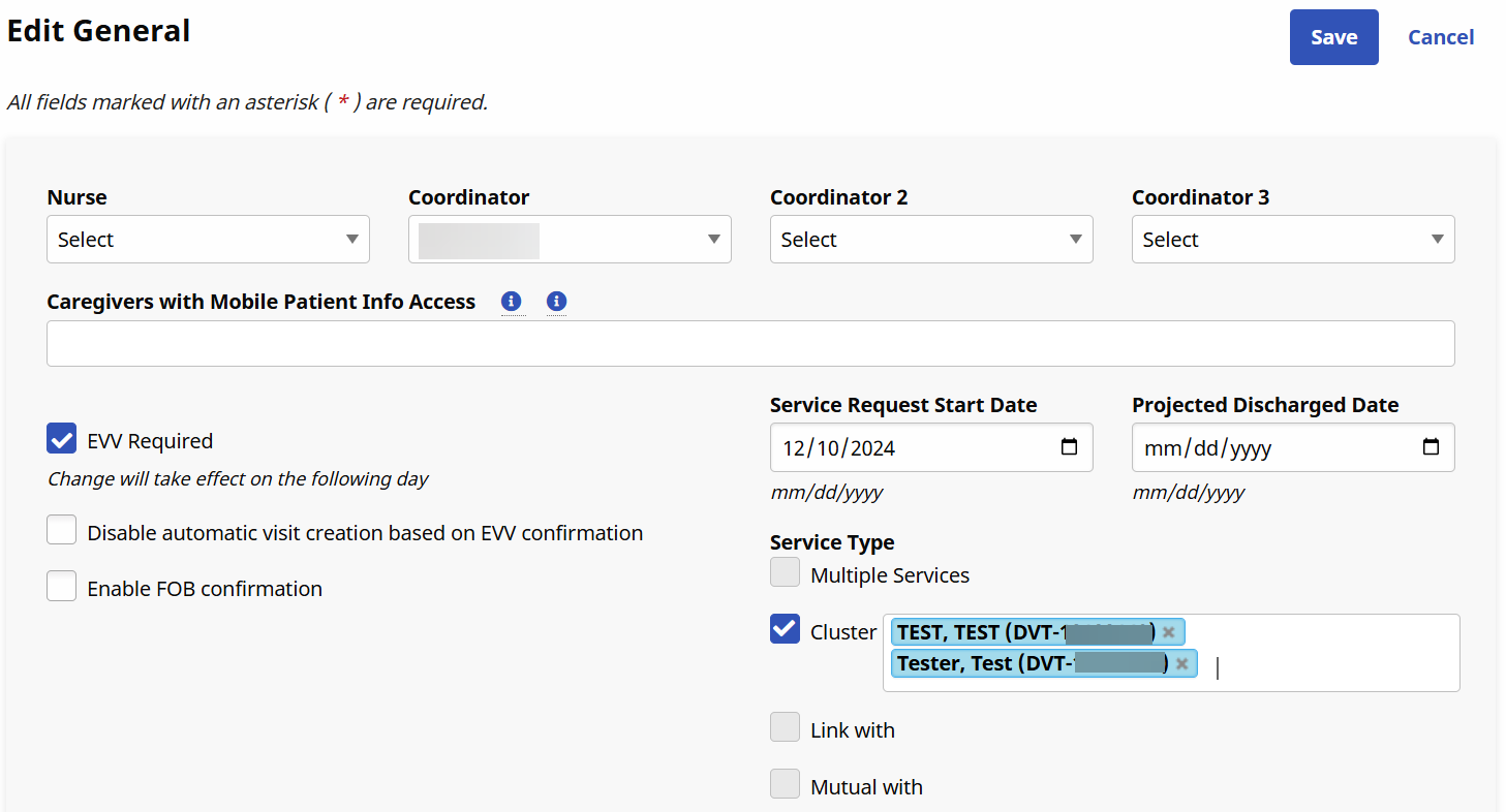 Complete all required fields. Select the applicable Service Code(s) to be used for scheduling Cluster visits. Click Save.