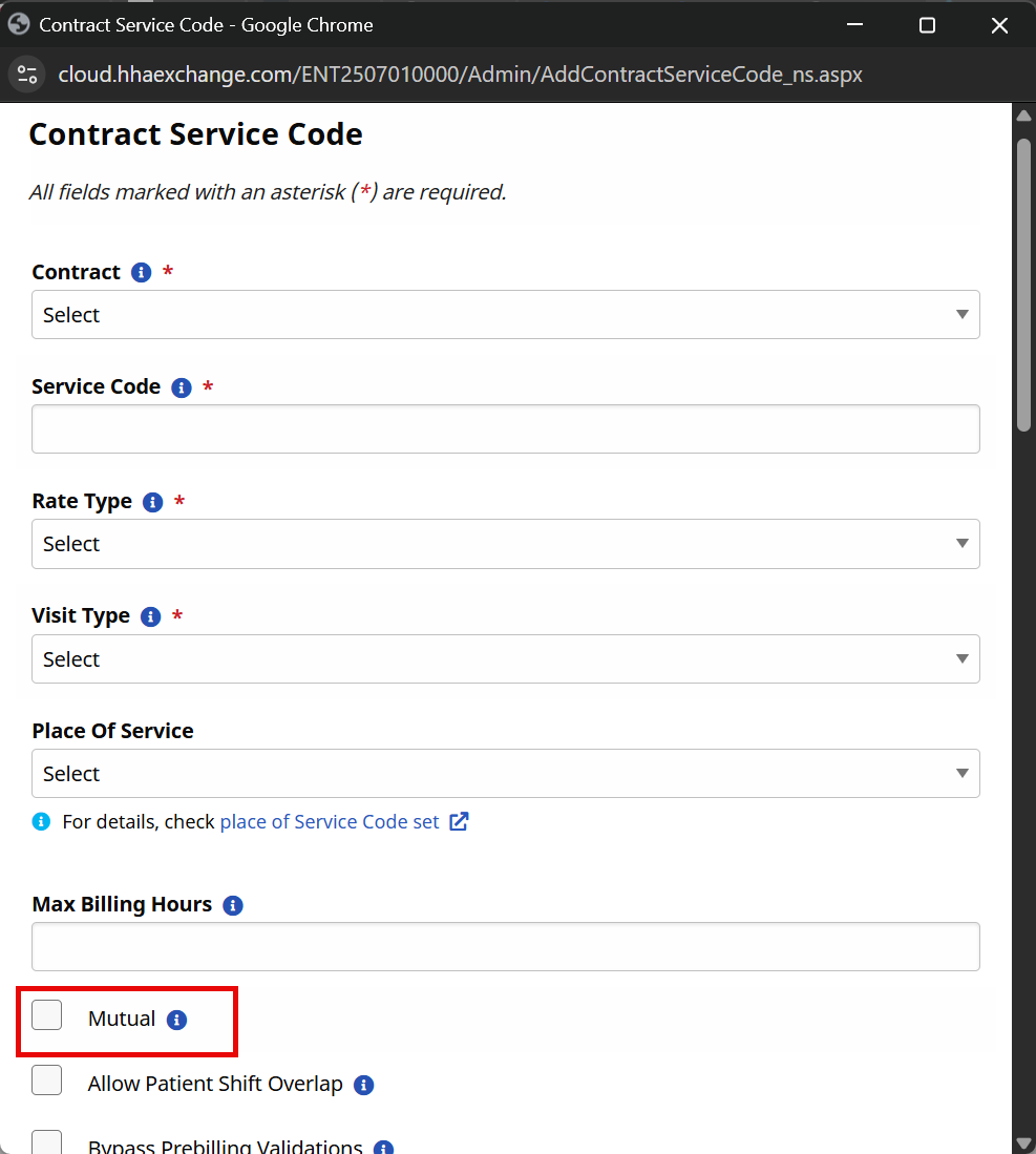 The Contract Service Code window opens. Complete all required fields. Select the Mutual checkbox and then select Save.