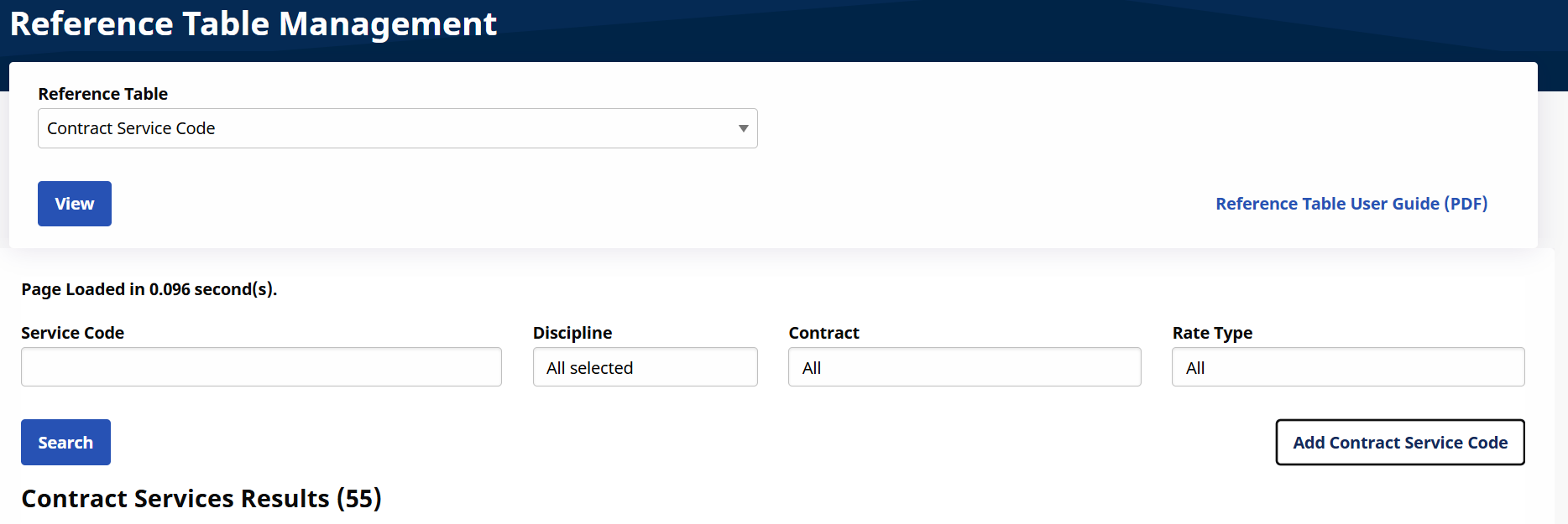 Select Contract Service Code under the Fiscal section from the Reference Table field. Click the Add Contract Service Code button to create a Service Code.