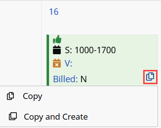 From the Patient’s Calendar page, click the Copy/Copy and Create icon in the Calendar day cell and select Copy and Create.