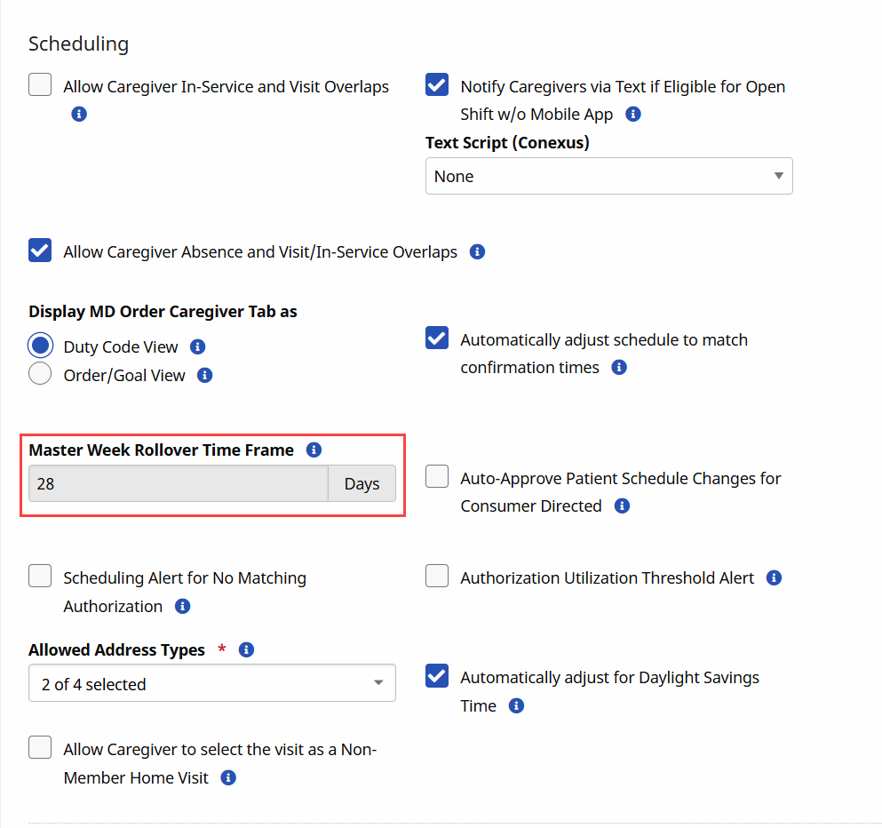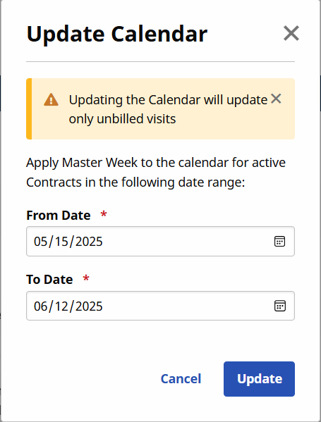 The Master Week rollover length can be customized to view and coordinate visits (schedules) on a monthly basis according to Authorization calculations. Because the Master Week rollover length may be adjusted for each Contract, the system needs to validate scheduled visits based on the Contract settings.