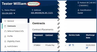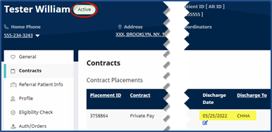 If the Patient only has a single Contract, receiving only Non-Skilled authorizations, and the Discharge Date is entered, then the Status changes to Discharged (on midnight, the day of). As a result, the Linked Contract Patient is the Active record.