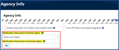 Providers can control which types of alerts to view and track by severity and type of interaction. In the Agency Profile page under Admin > Agency Profile under the General section, select the severity type (level) from the Medication Interaction Severity Types dropdown field and the screening types from the Medication Interaction Screening Types dropdown field.