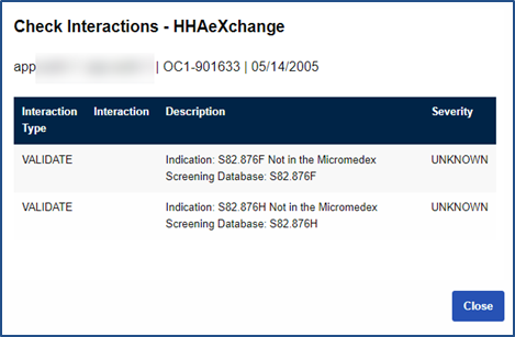 The Drug/Allergy/Disease Interactions Checker allows Agencies to view and track a Patient’s medication interactions (for example, allergic reactions and severity), as seen in the following image (displaying the Check Interactions window).