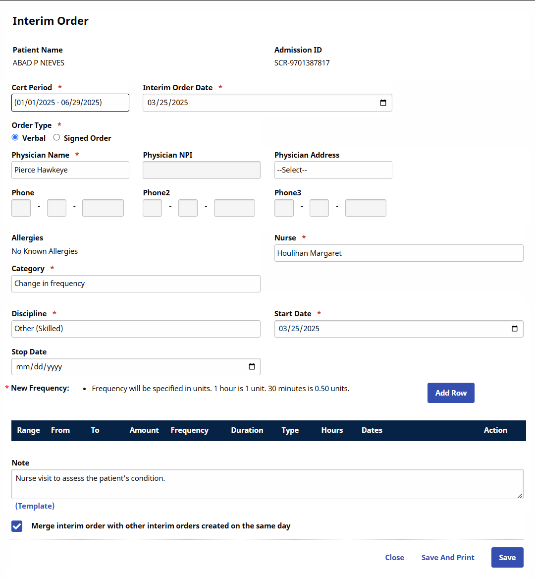 An Interim Order is an addendum to an active MD Order. Interim Orders are issued for changes in medication, the type of service the Patient receives, or the frequency of service.