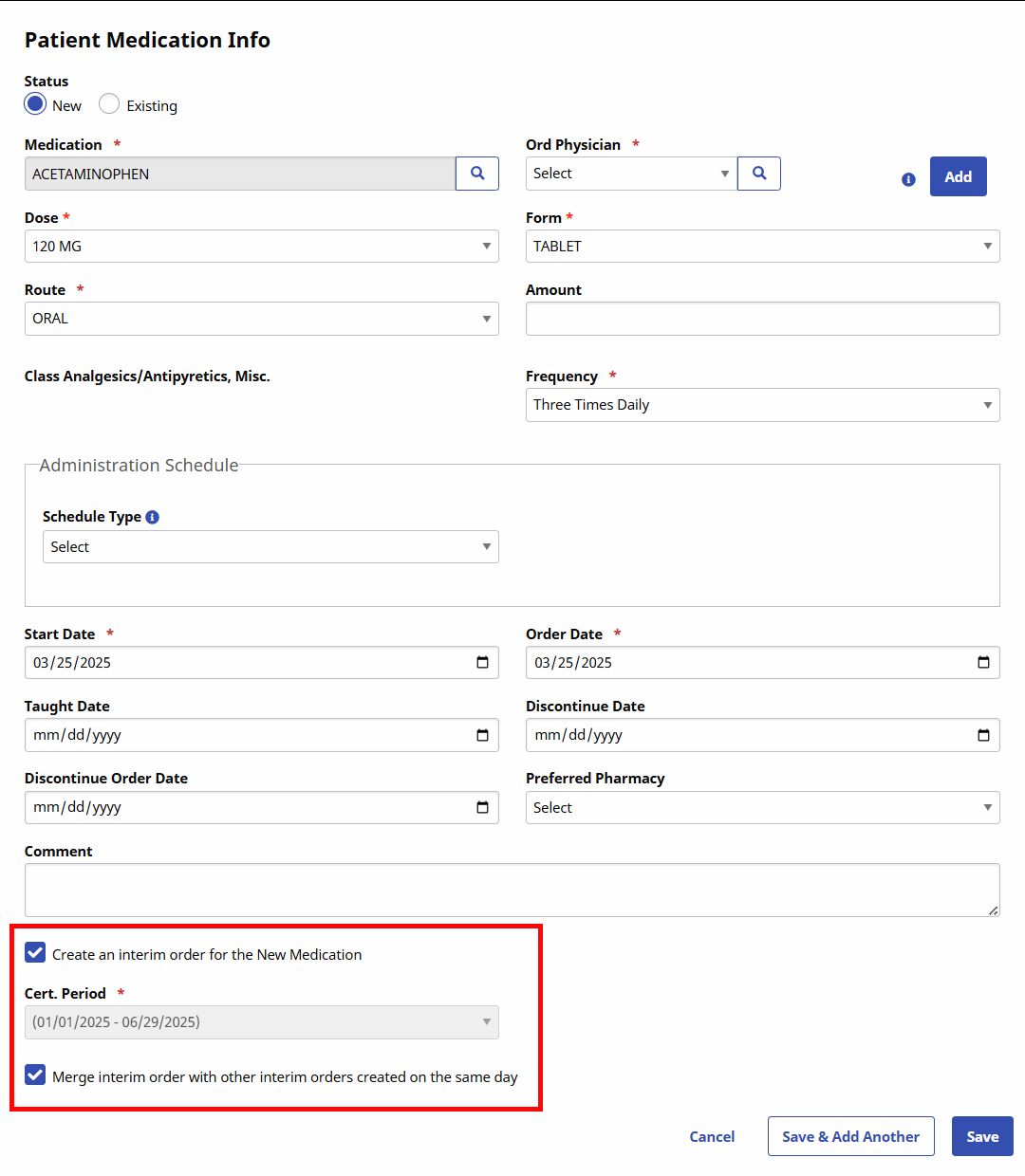 Interim Orders for medication changes are generated by entering the new medication on the Med Profile and selecting the Create an interim order for the Medication checkbox.