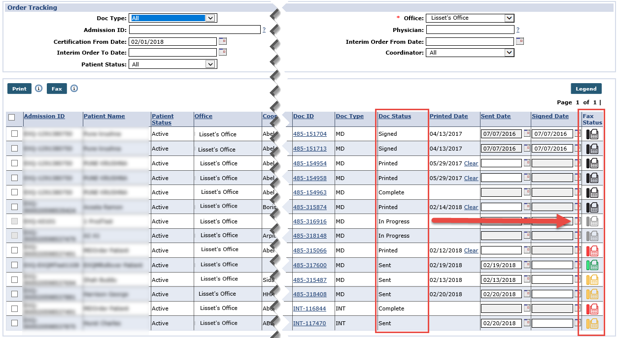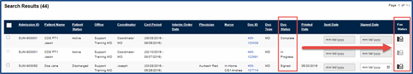 On the results panel, a Fax Status column with a Fax icon facilitates faxing directly from the page. Users can either fax or print individual Orders or in bulk from this page, providing that the Doc Status permits.