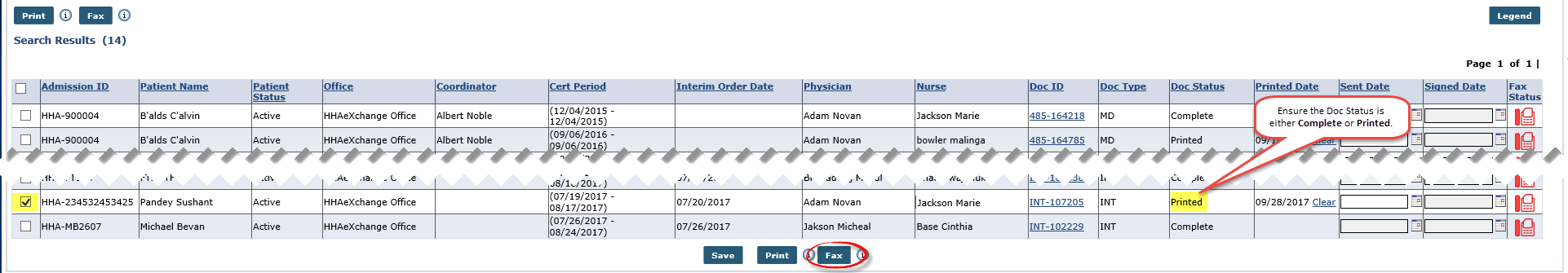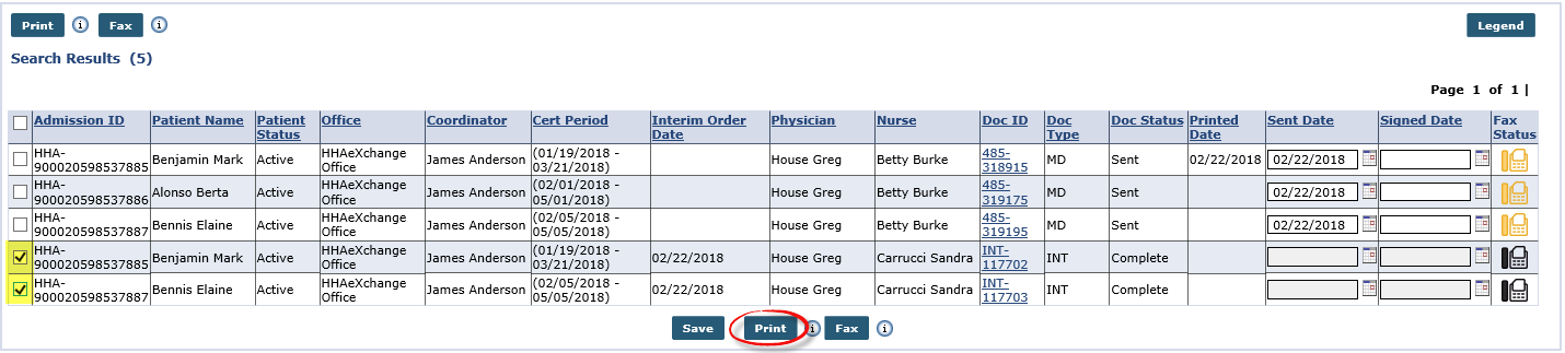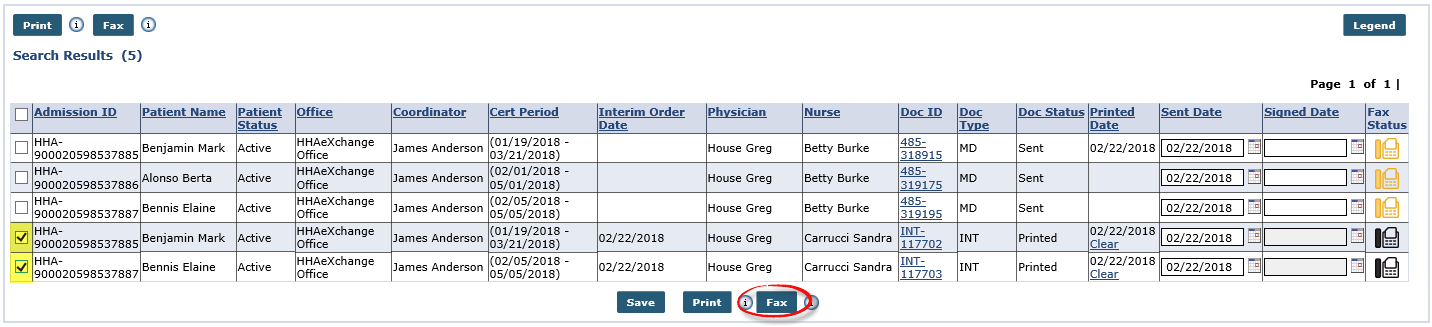 To re-fax an MD or Interim Order, ensure that the Doc Status is either Complete or Printed. Select the checkbox to the far-left and click the Fax button.
