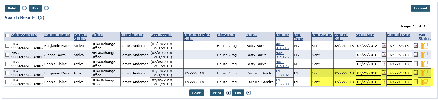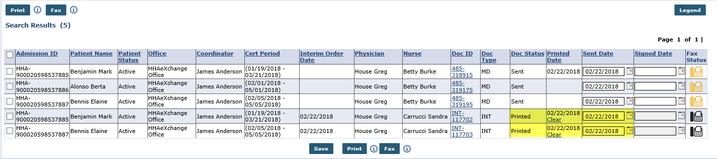If printing multiple records, the Document Types must be the same. MD Orders and Interim Order cannot be printed simultaneously. HHAeXchange does not allow users to enter a Signed Date for an MD Order (meaning Physician-verified), until it has gone through the Status cycle as follows: In Progress > Printed > Sent > Signed.