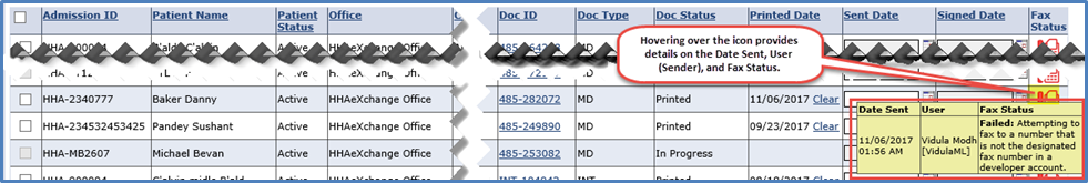 If a fax attempt fails, the icon appears in red. Hovering over the icon provides a pop-up window indicating the Date Sent, User (Sender), and the Fax Status.