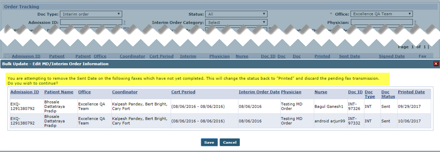 The Sent Date field becomes blank, and the system checks for any faxes in the sending process. Thereafter, the system prompts the user with a confirmation message to OK (continue) or Cancel.