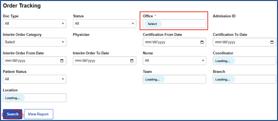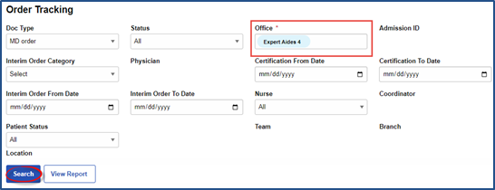 On the Order Tracking under Action > Order Tracking page, select the required Office field and click the Search button to generate a search.