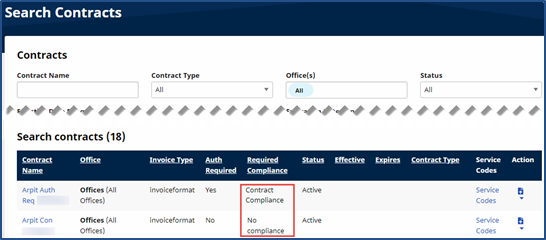 For a high-level view of Compliance Requirements, go to Admin > Contract Setup > Search Contract. On the search results, refer to the Required Compliance column for defined compliance settings. To view the Required Compliance settings, click the applicable Contract Name link.