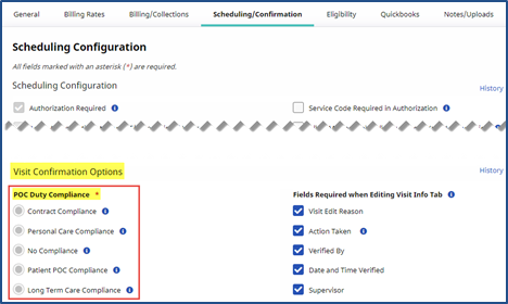 Select the Scheduling/Confirmation tab. The compliance options are listed under the POC Duty Compliance field as well as the Count Refused Duties Toward Compliance Totals. These fields are un-editable; settings are based on the Provider’s Office level data configured by HHAeXchange.