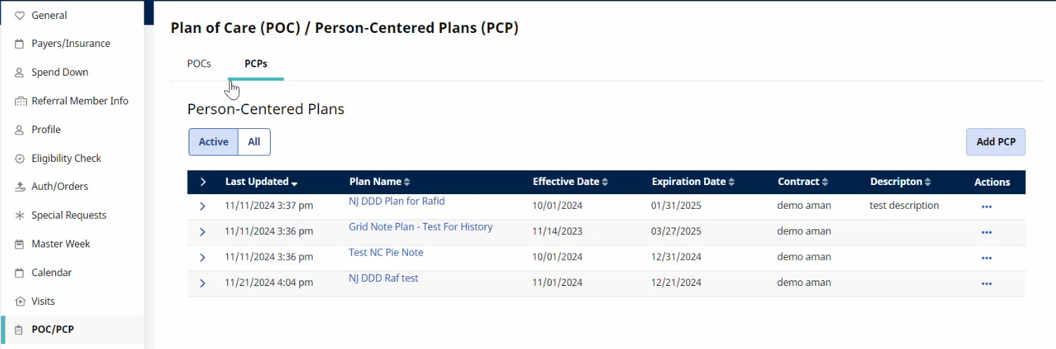 The Person-Centered Plans (PCP) feature under Patient > Search > Select a Patient > POC/PCP > Person-Centered Plans (PCP) tab is used to create and track goals that help patients be self sufficient as a part of Care Planning in IDD/DDD programs.
