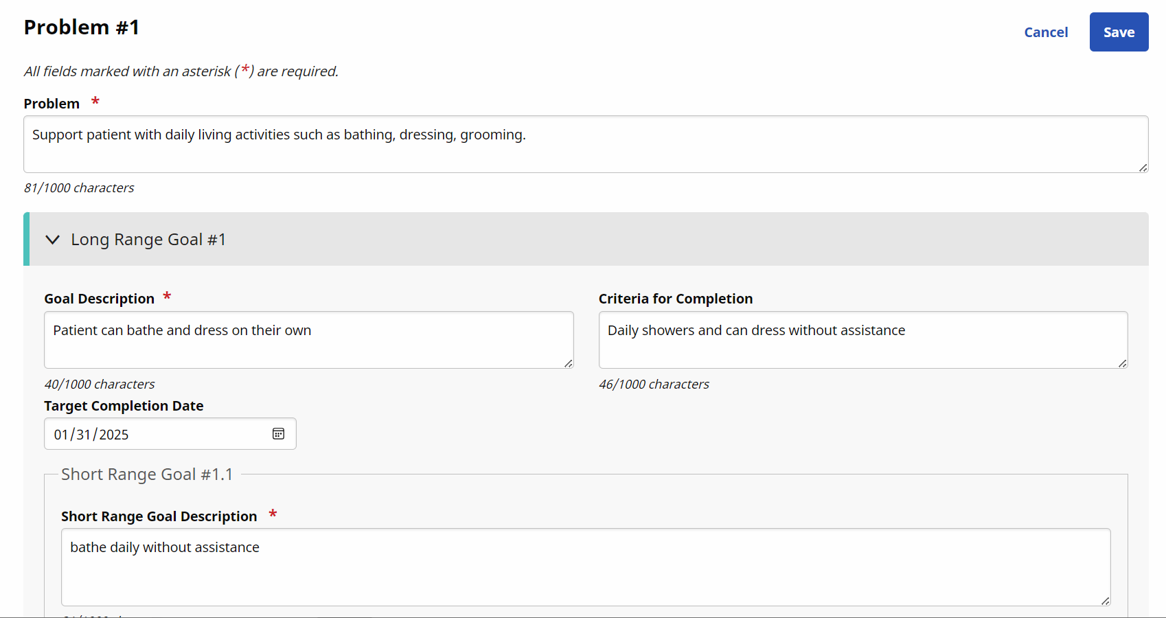Enter details for Problem #1 in the Problem field. Each problem can have multiple Long Range and Short Range goals. Create details in as many Problem(s) to reach the successful goal.