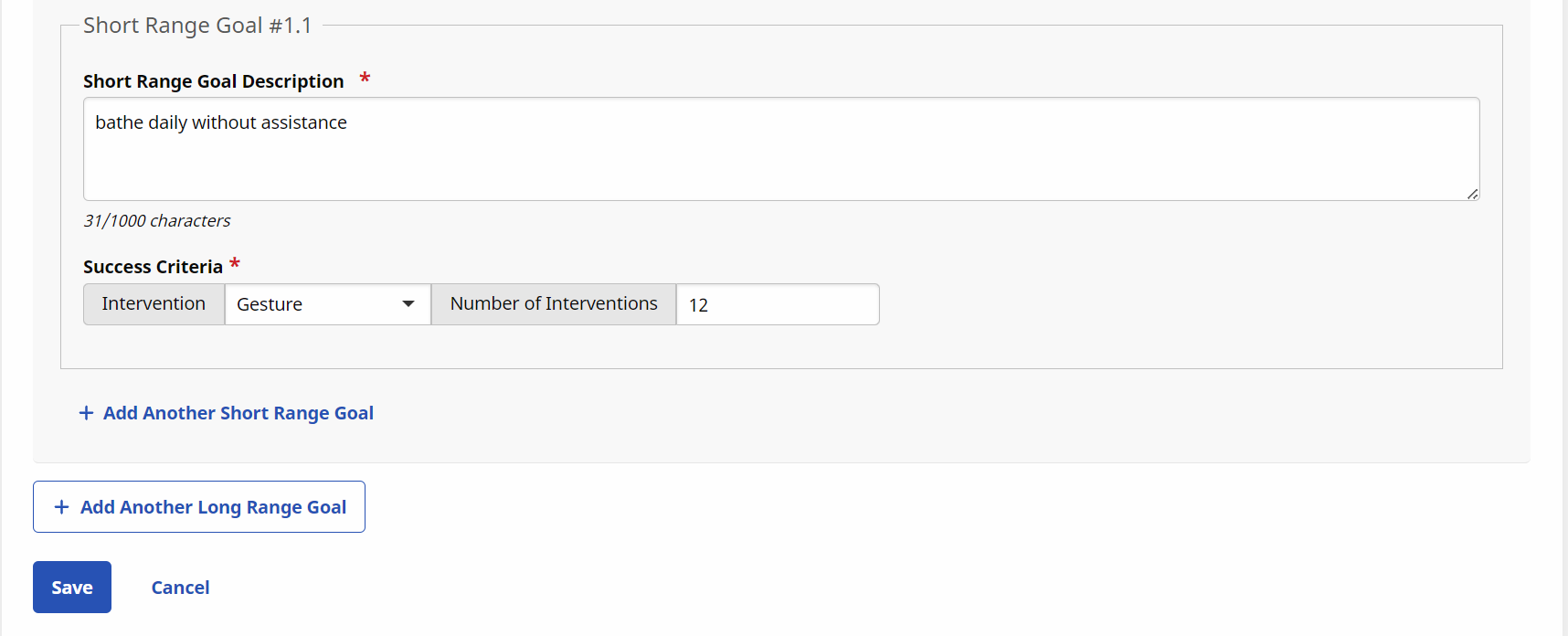 In the Number of Interventions field, define the number of interventions to pass or fail the patient for the short range goal. If the patient exceeds the number of interventions, they fail the short range goal.