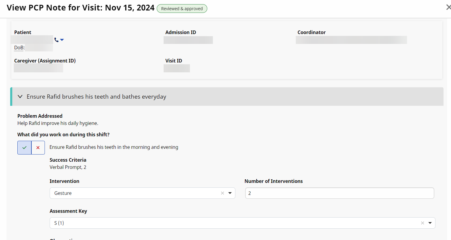 The Visit Notes section of PCP displays completed data the Caregiver entered in Goals section of the Mobile App during the Visit.