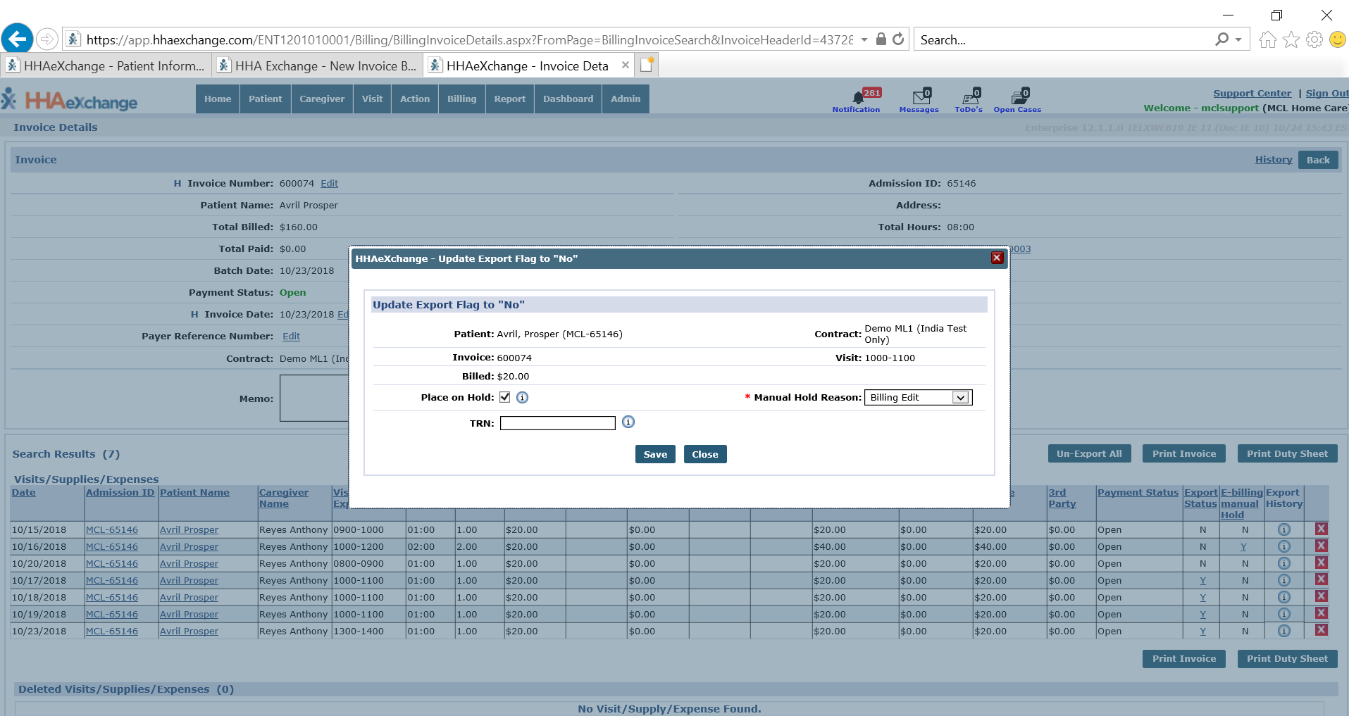 Locate the Invoice and Visit. Click the Y link under the Export Status column.