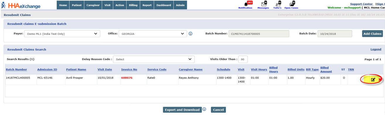The Resubmit Claims window opens with the selected claim. Click the Edit icon.