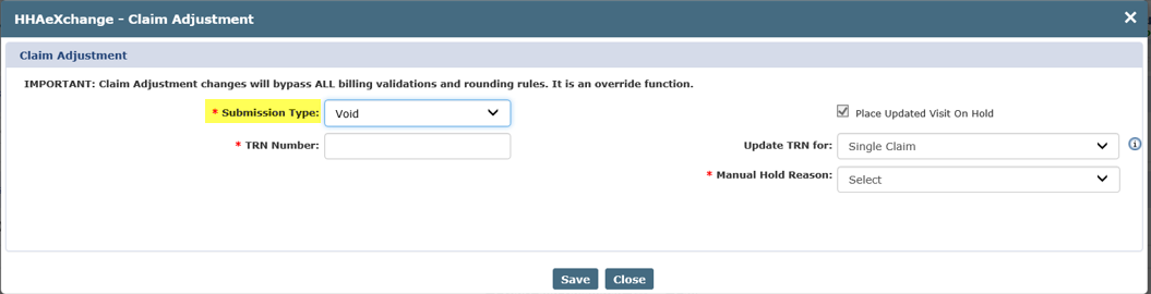 The Claim Adjustment window opens. Select Void in the Submission Type field and enter the TRN Number in the required (text box) field. The Place Updated Visit on Hold is automatically selected, select a Manual Hold Reason and click Save.