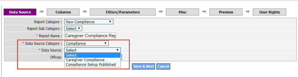 Any Caregiver Compliance reports which were previously created within the Reporting Tool using a different Data Source Category (such as Caregiver) should be recreated by selecting Compliance from the Data Source Category dropdown.