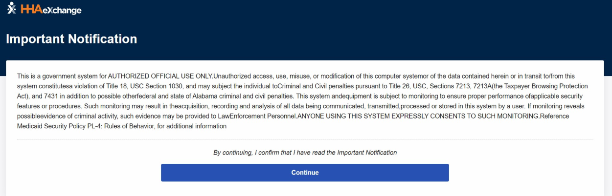 Some users may be required to acknowledge a Privacy and Confidentiality statement before accessing the HHAeXchange system. Click Continue to acknowledge the statement and proceed to the home page.