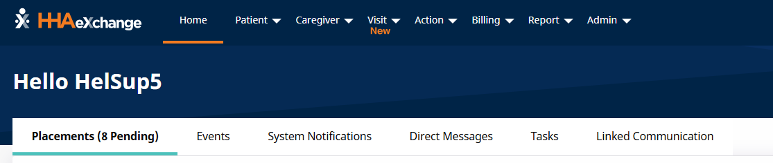The Home page tabs provide internal communications tools collectively used to handle HHAeXchange communications between internal employees and with all active Caregivers.