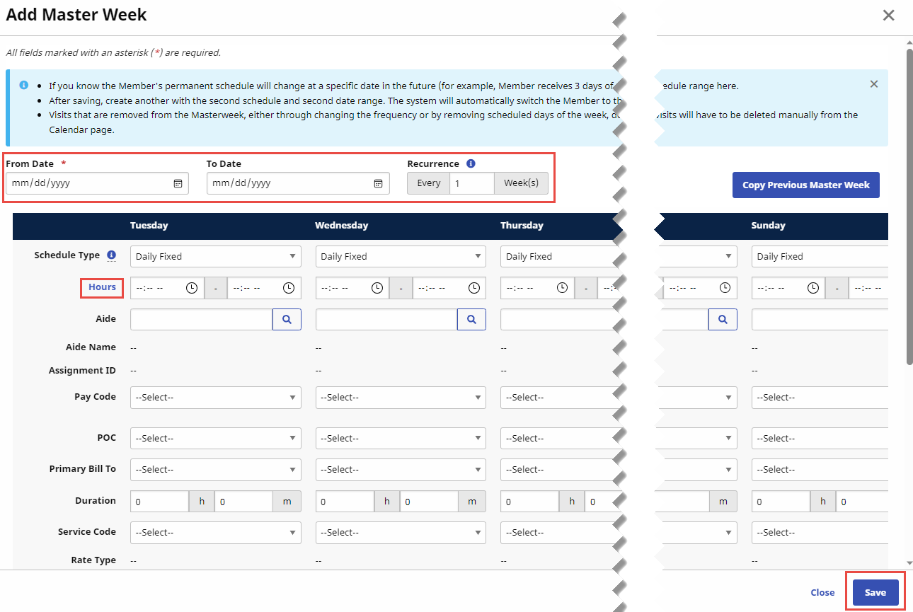 The To Date field can be left blank to indicate an indefinite stop date. If you enter a To Date, the system won't generate visits from this master week past that date.