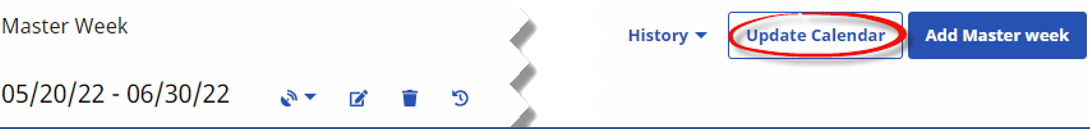 At the top right of the Master Week page, click Update Calendar to place scheduled visits on the patient’s calendar based on the master week you just created. Click History if you want to review Rollover and Deleted Master Week History.