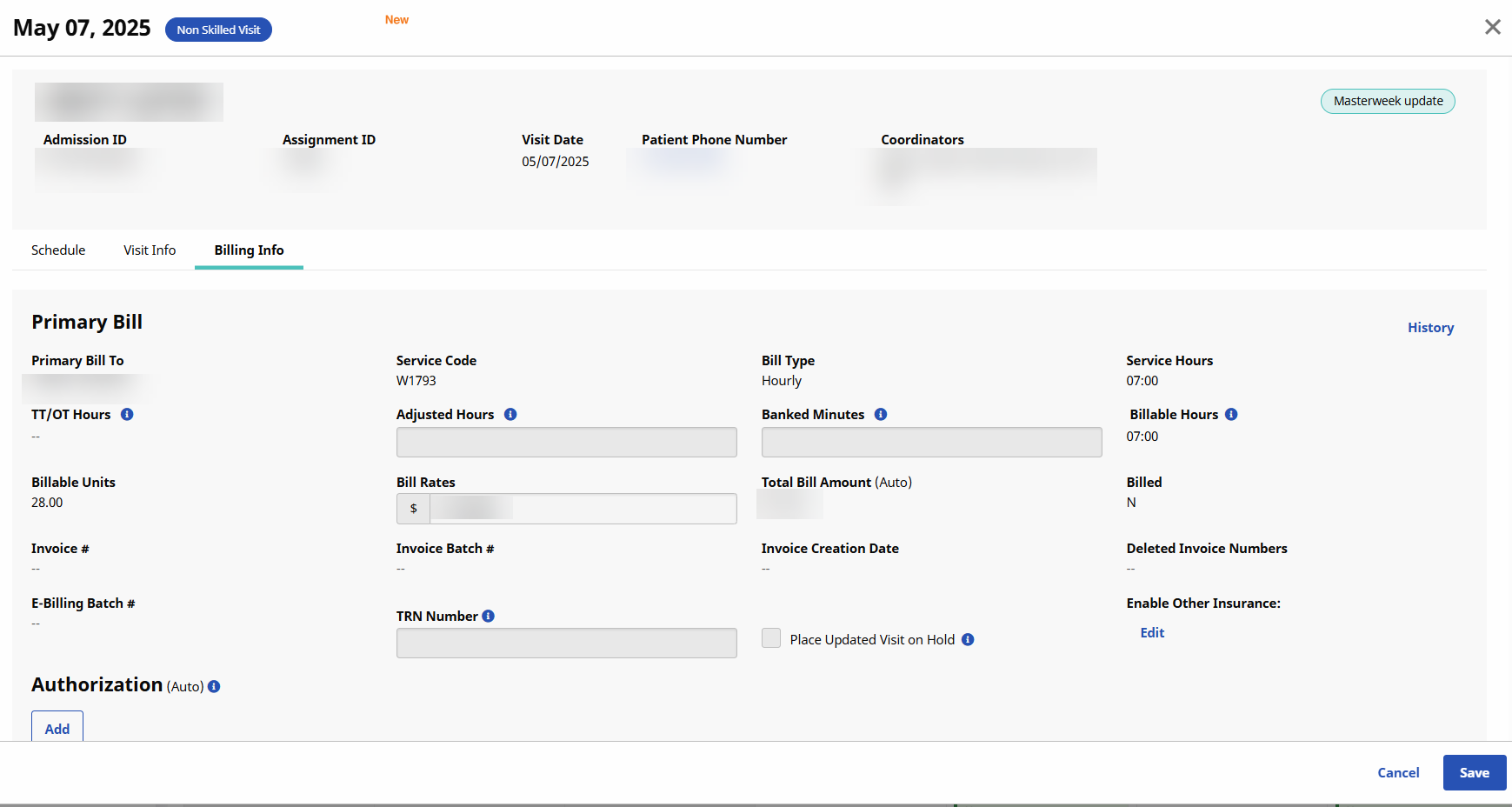 Click Save. The EVV Reason Code Number/ Reason Code field is required when the Adjusted Hours field is updated.