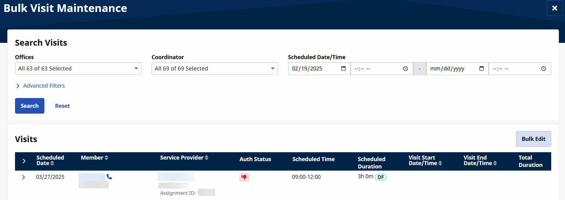 To adjust the billable hours from the Bulk Visit Maintenance feature: