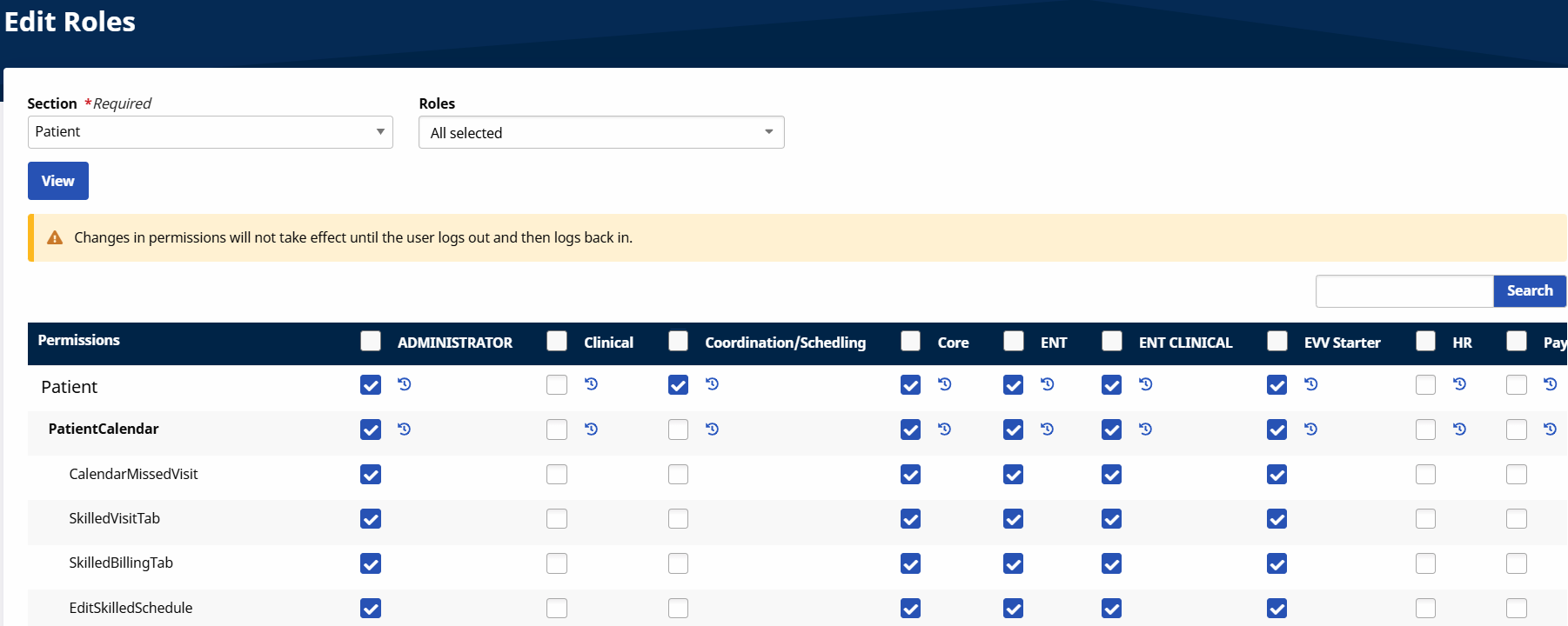 Permissions to the Appointments function are role-based and granted via the Edit Roles page under Admin > User Management > Edit Roles.