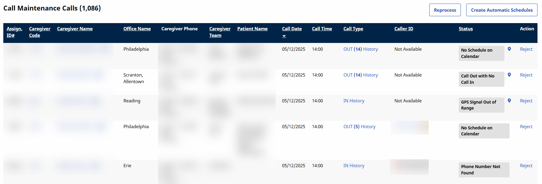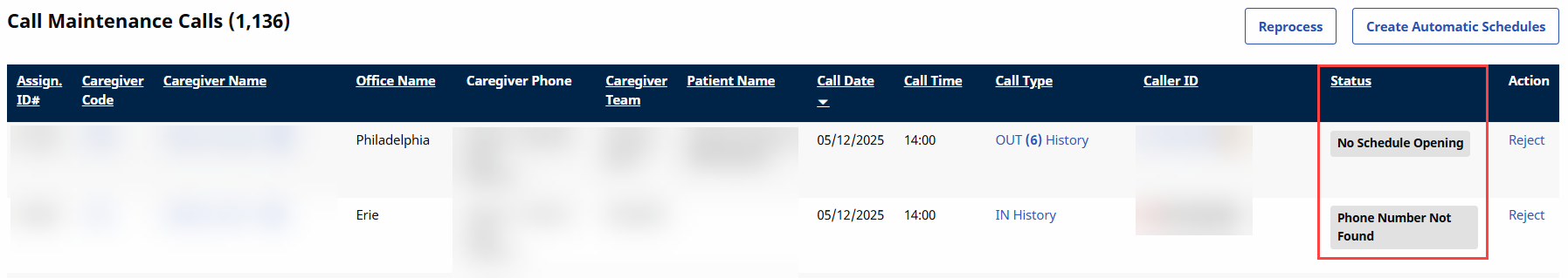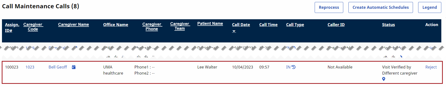 On the Call Maintenance tab, click Reject under the Action column.