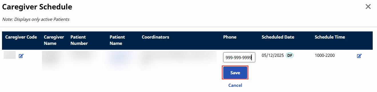 After determining that the Caller ID number is a legitimate second phone line for the Patient, click the Edit icon (Phone2) in the Phone column to edit the phone number for the Patient. Click Save to save the change.