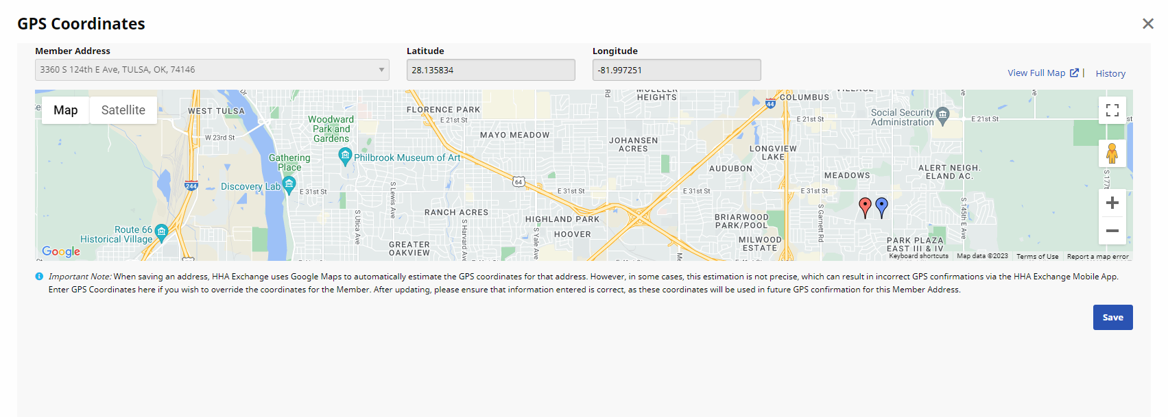 Click Save at lower right to overwrite the Google coordinates with the EVV coordinates.