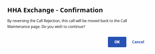 Rejected Calls may be reversed if an EVV was mistakenly rejected. Reversing a rejected call sends it back to the Call Maintenance tab, where the EVV can be linked to the appropriate visit. Complete the following steps to reverse a rejection in the system.