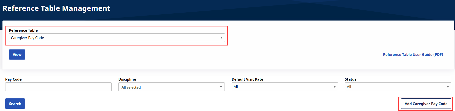 Click View to view the existing Pay Codes. To add a new Pay Code, click Add Caregiver Pay Code.