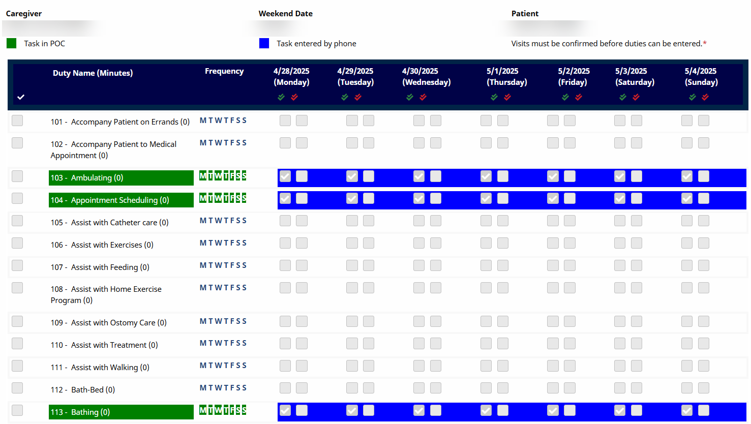 Duties that are part of the Patient Plan of Care display in green. Those entered by the Caregiver using EVV display in blue.