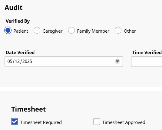 Select the entity that verified the visit as well as the date and time of the verification. To prevent billing issues, select the Timesheet Required checkbox followed by the Timesheet Approved checkbox after the physical timesheet is submitted.