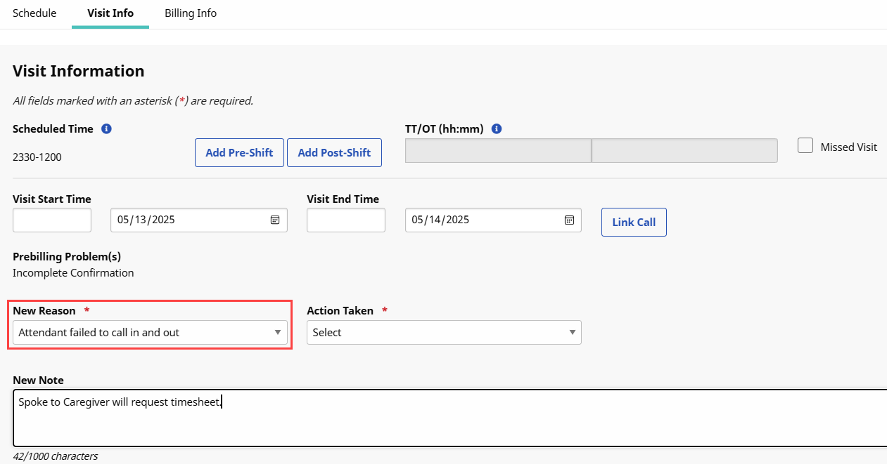 On the Visit Info tab, manually update the necessary confirmation details based on the Agency’s internal policies. Select the New Reason from the required field.