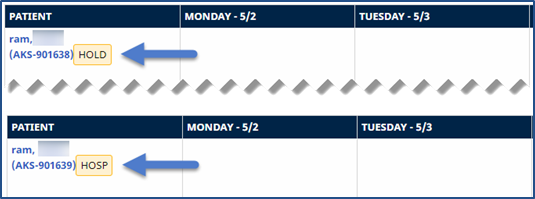 The Appointments page displays the Patient’s Status as Hold or Hospitalized when applicable. It also marks the Start Date of the Status change in the corresponding visit cell.