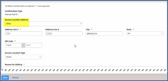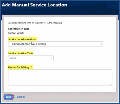 In the Add Manual Service Location window, select Primary, Patient, or Other from the Select Location Address field. Select the Service Location Type. Enter the Reason for Editing the manual service location. Click Save.